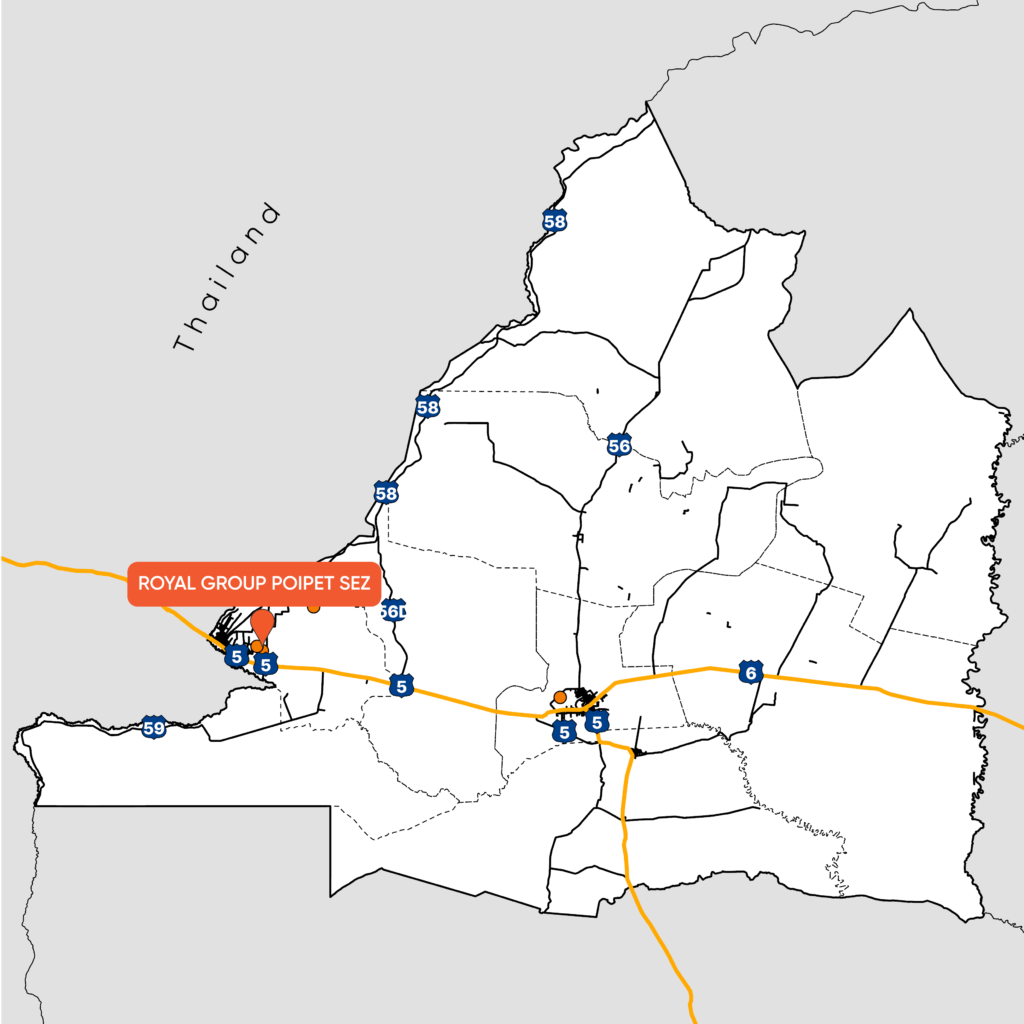Royal Group Poipet SEZ is a Special Economic Zone (SEZ) developed and operated by Royal Group Poipet SEZ Co., Ltd., a subsidiary of Phnom Penh SEZ Plc. The SEZ is located in Banteay Meanchey Province, Northwestern Cambodia, approximately 8 km east of the Poipet city center. Its strategic location near the Cambodia-Thai border makes it attractive to prospective investors who are looking to start new manufacturers, warehouses, or distribution centers.