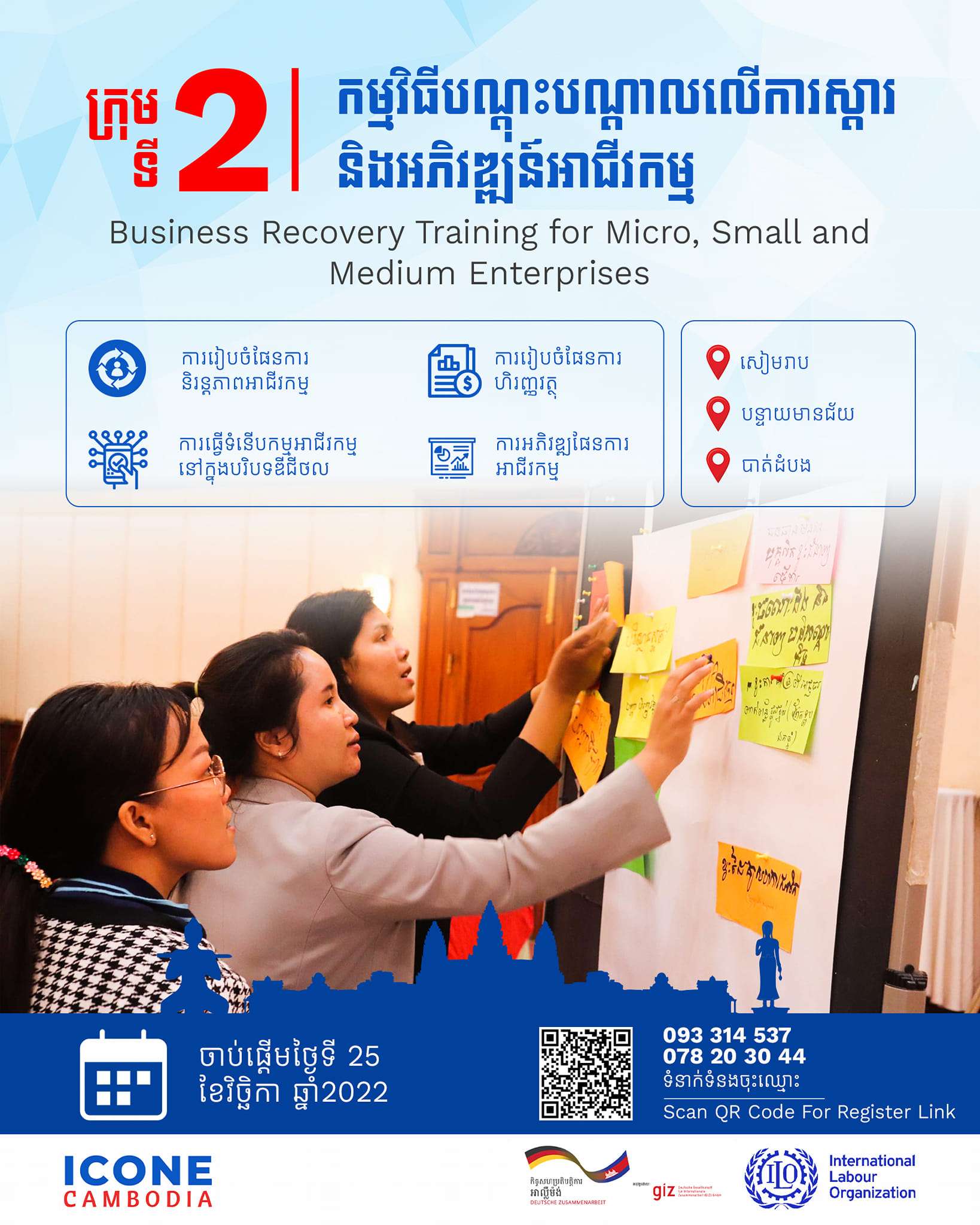 កម្មវិធីពង្រឹងភាពប្រកួតប្រជែងនៃសហគ្រាសជាតិ(ICONE) បានបន្តការសហការរួមគ្នានឹងអង្គការពលកម្មអន្តរជាតិ(ILO) ដើម្បីបន្តរផ្តល់ការគាំទ្រទៅដល់អាជីវកម្មធុនតូច និងមធ្យម គោលបំណងដើម្បីឆ្លើយតបទៅនឹងការងើបឡើងវិញនៃអាជីវកម្មក្រោយពីរងផលប៉ះពាល់ពីកូវីដ-១៩។ ការគាំទ្រនេះនឹងផ្តោតទៅលើខេត្តគោលដៅចំនួន៣ គឹខេត្តបាត់ដំបង បន្ទាយមានជ័យ និងខេត្តសៀមរាប តាមរយៈការផ្តល់វគ្គបណ្តុះបណ្តាលជំនាញអភិវឌ្ឍន៍អាជីវកម្ម ក៏ដូចជាការផ្សារភ្ជាប់ទៅនឹងលទ្ធភាពទទួលបានហិរញ្ញបទានដើម្បីស្តារអាជីវកម្មឲ្យងើបឡើងវិញប្រកបទៅដោយនិរន្តភាព និងសម្របខ្លួនថ្មីក្នុងយុគសម័យឌីជីថល។